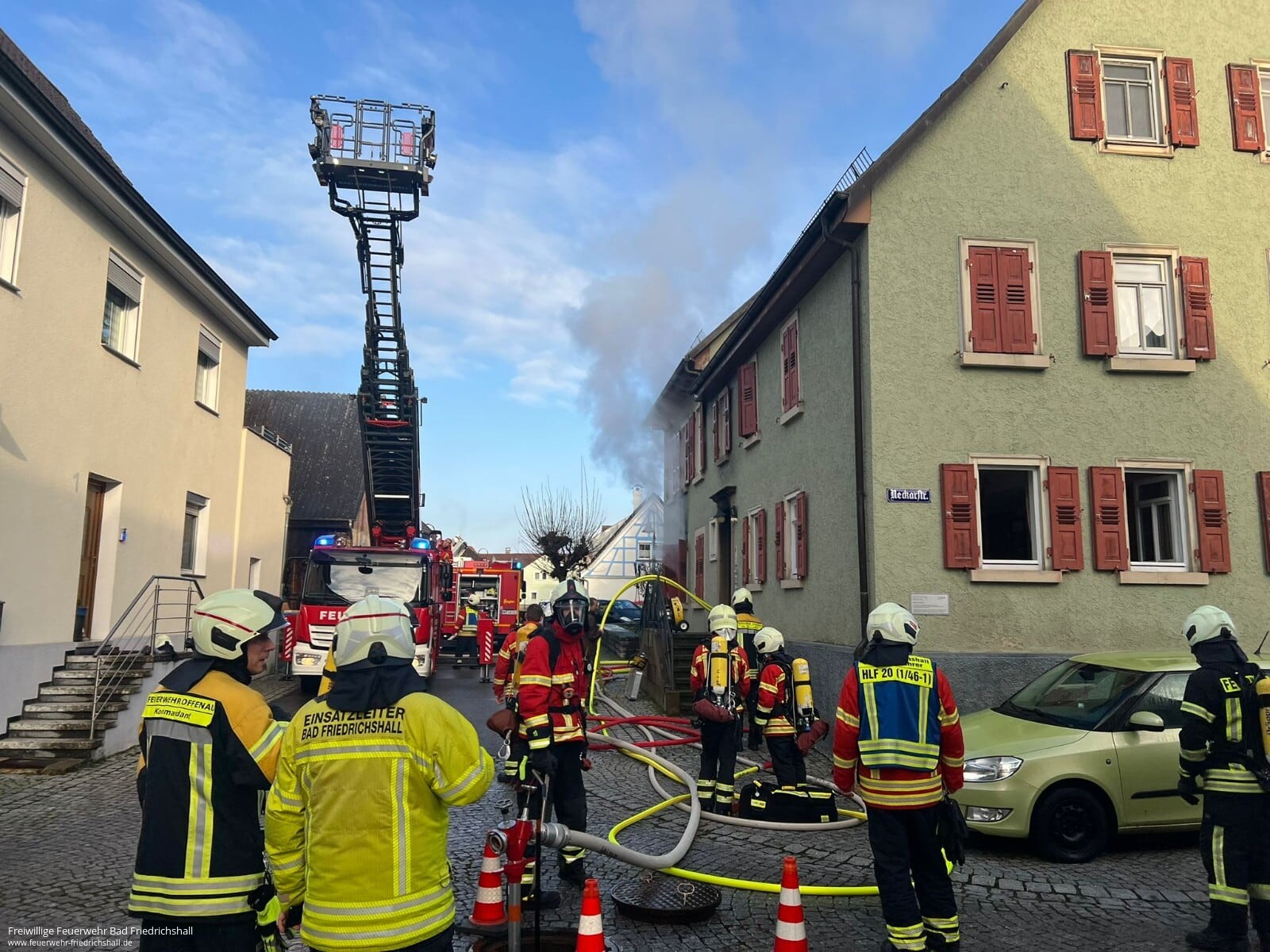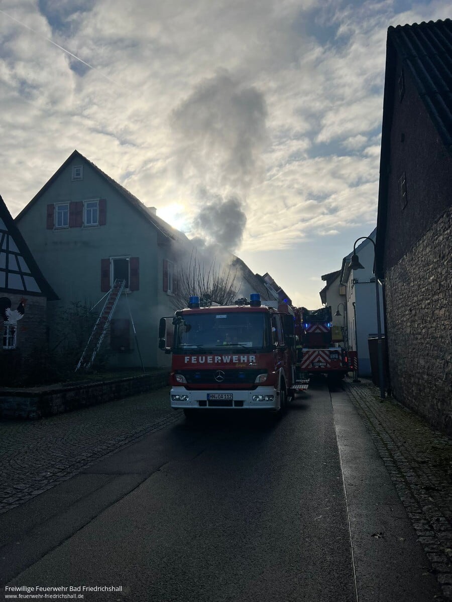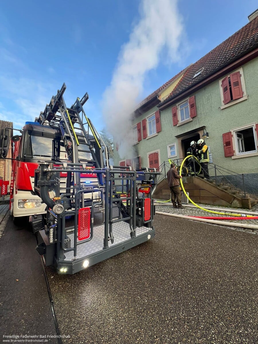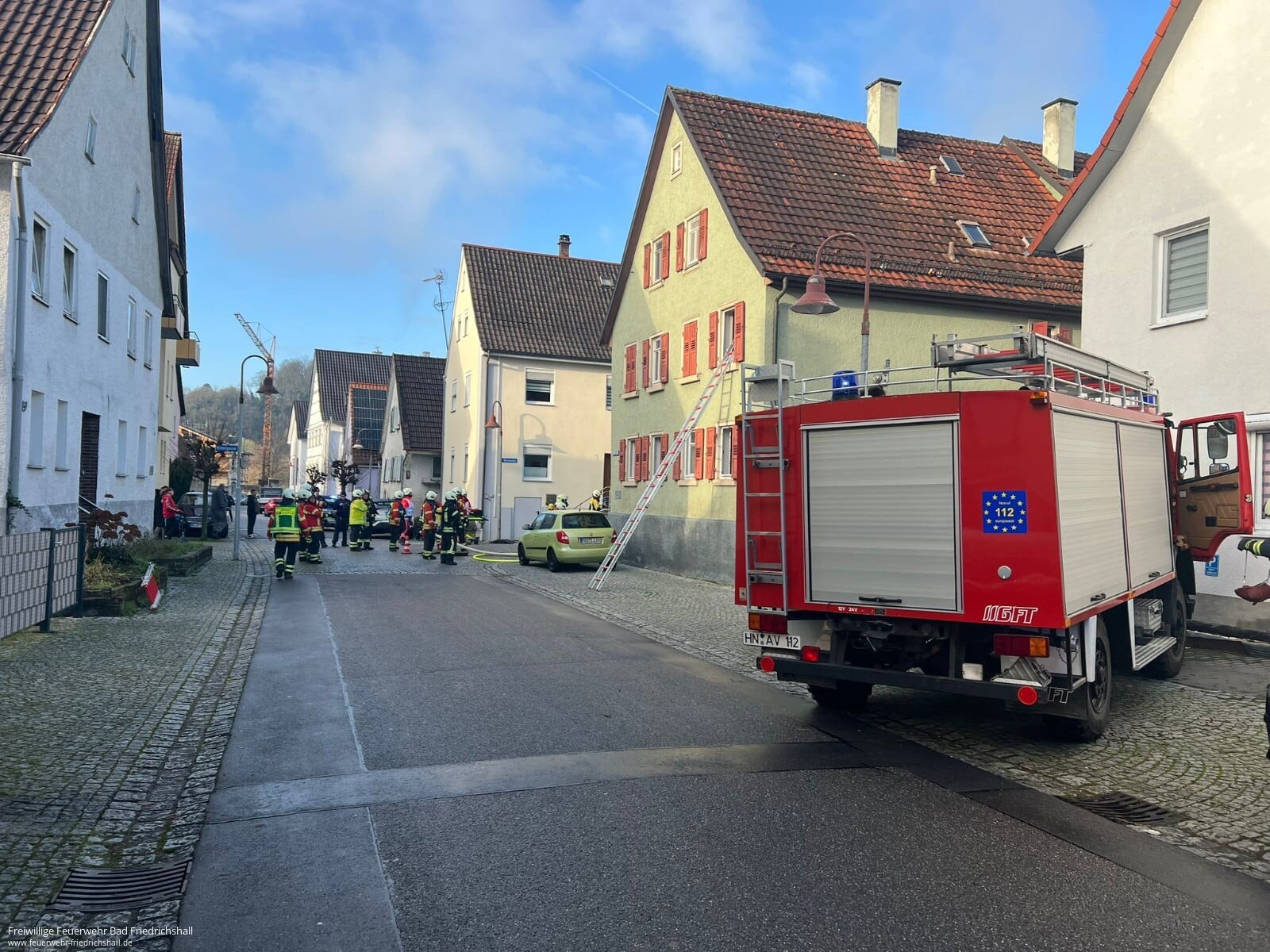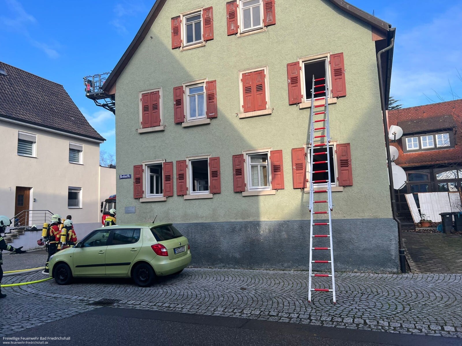 Von der Feuerwehr Offenau wurde die Feuerwehr Bad Friedrichshall mit einem Löschzug zu einem Wohnungsbrand nachgefordert. In einer Erdgeschosswohnung eines Mehrparteienhaus war aus bislang ungeklärter Ursache ein Brand ausgebrochen. Der Bewohner der Wohnung hatte geschlafen und wurde von einem Rauchwarnmelder geweckt. Auch sein Hund merkte das irgendwas nicht in Ordnung war und drängte darauf, die Wohnung zu verlassen. Durch die starke Rauchentwicklung und Hitzeeinwirkung war der Fluchtweg für die Bewohner aus dem Obergeschoss über das Treppenhaus nicht mehr möglich. Über tragbare Leitern der Feuerwehr konnten zwei Frauen und ein Jugendlicher aus dem 1. Obergeschoss gerettet werden. Alle Bewohner wurden vom Rettungsdienst und dem anwesenden Notarzt untersucht - glücklicherweise wurde niemand ernsthaft verletzt. Mehrere Trupps unter Atemschutz sowohl der Feuerwehr Offenau wie auch der Feuerwehr Bad Friedrichshall waren zur Brandbekämpfung im Innenangriff im Gebäude. Mehrfach wurde das Haus, welches aufgrund des Baujahrs (1842) sehr verwinkelt war, nach möglichen weiteren Personen abgesucht. Die Bad Friedrichshaller Drehleiter wurde zur Anleiterbereitschaft im Eingangsbereich in Stellung gebracht. Im weiteren Verlauf wurde eine Überdruckbelüftung des kompletten Gebäudes durchgeführt. Durch die starke Brandeinwirkung wurde die Haustechnik stark in Mitleidenschaft gezogen. Von einem Feuerwehrelektriker wurde daher die Panzersicherung des Gebäudes gezogen und somit das Haus stromlos geschalten. Das Gebäude ist vorerst unbewohnbar. Alle Bewohner kamen erfreulicherweise kurz vor Weihnachten bei Freunden und Verwandten unter. Bürgermeister Folk war ebenfalls vor Ort, machte sich ein Bild der Lage und kümmerte sich um die Unterbringung der Bewohner. Bei Bedarf, hätte die Gemeinde eine Notunterkunft zu Verfügung gestellt.