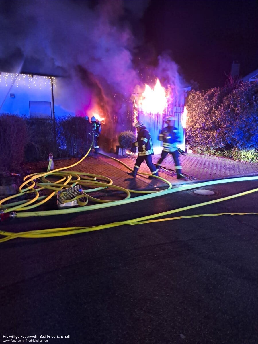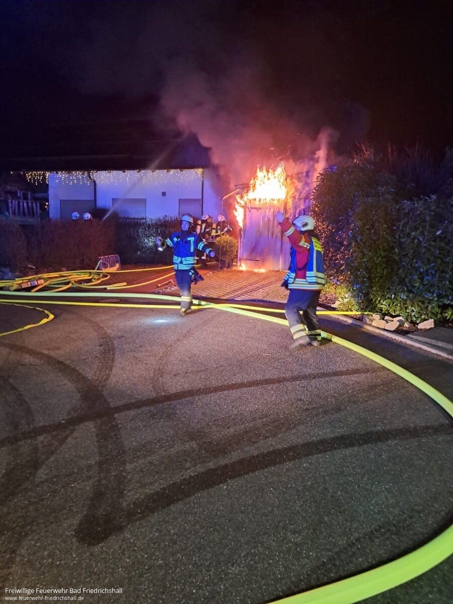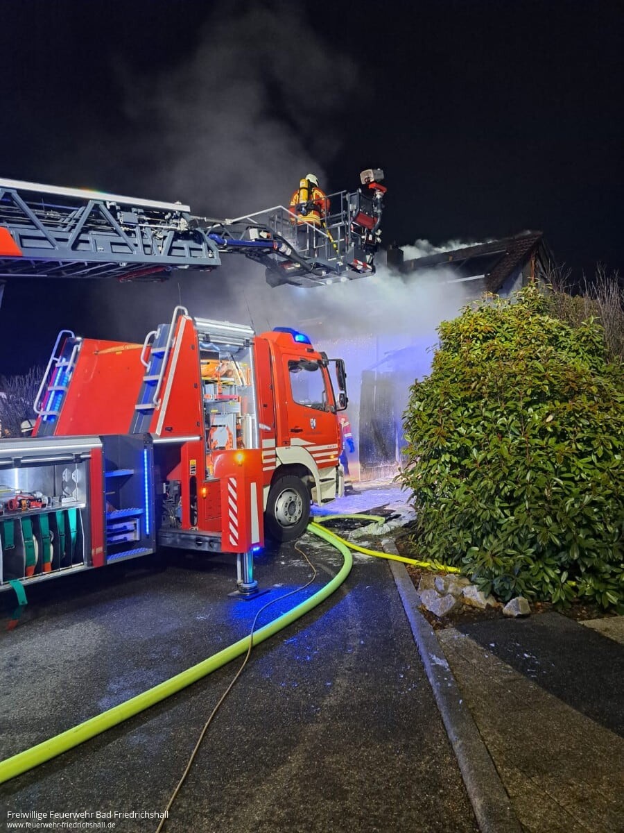 Um 19:41 Uhr wurde die Feuerwehr Bad Friedrichshall mit einem kompletten Löschzug von der Feuerwehr Oedheim zu einem Dachstuhlbrand alarmiert. Aus bislang ungeklärter Ursache kam es zu einem Brand in einem unmittelbar neben dem Wohnhaus stehenden Holzschuppen. Beim Eintreffen der Feuerwehr stand der Schuppen in Vollbrand und hatte bereits auf den Dachstuhl des Wohnhauses übergegriffen. Mit mehreren C-Rohren sowie dem Wenderohr der Drehleiter konnte eine Ausbreitung des Brandes auf den kompletten Dachstuhl verhindert werden. Im weiteren Verlauf des Einsatzes kam aufgrund brennbarer Flüssigkeiten ein Schaumrohr zum Einsatz. Mehrere Trupps unter Atemschutz kamen über eine Einsatzdauer von mehreren Stunden zum Einsatz. Glücklicherweise konnte die Familie rechtzeitig und unverletzt das Gebäude verlassen.