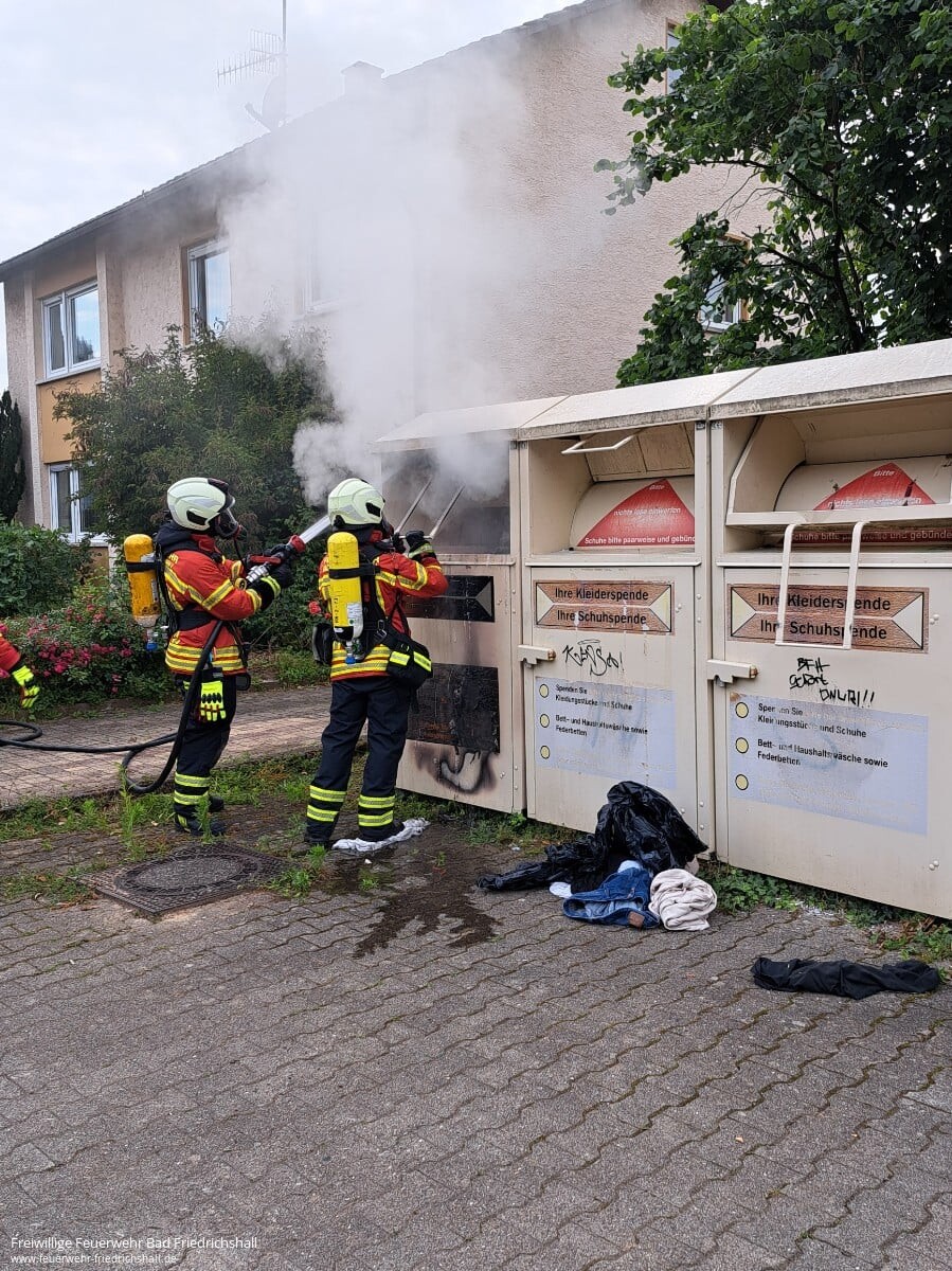 Um 19:44 Uhr wurde die Einsatzabteilung Bad Friedrichshall mit dem Stichwort „Kleinbrand“ in den Stadtteil Kochendorf alarmiert. Dort brannte der Inhalt eines Altkleidercontainers. Die Rauchentwicklung war bereits auf der Anfahrt sichtbar. Ein Trupp unter Atemschutz öffnete gewaltsam den Container und konnte den Brand rasch mit einem C-Rohr ablöschen.