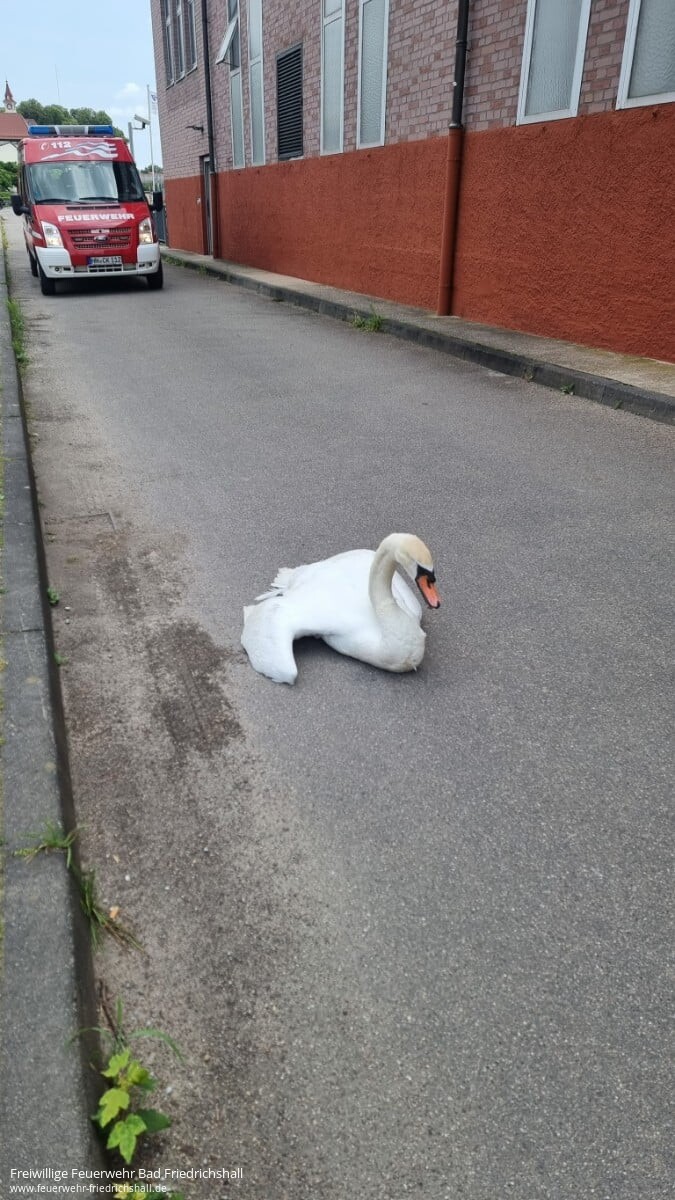 Die Einsatzabteilung Bad Friedrichshall wurde um 12:30 Uhr zur Schleuse Kochendorf alarmiert. Dort beobachteten Passanten wie ein Schwan aus dem Neckar gestartet und gegen die Wand des Kraftwerks geflogen war. Schwer verletzt blieb der Schwan auf der Straße liegen. Von der Feuerwehr wurde der Wasservogel eingefangen und in die Tierklinik gebracht.