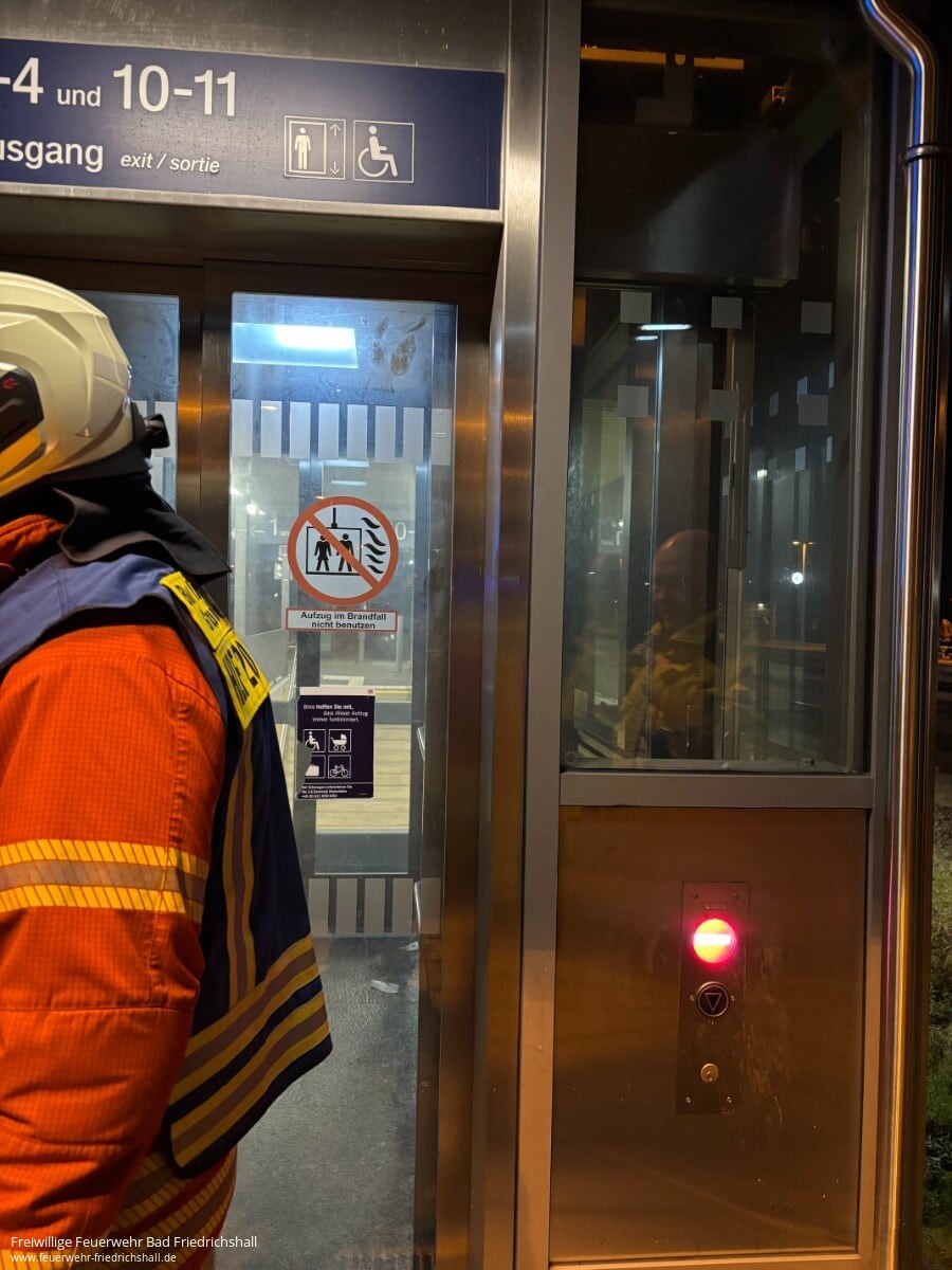 Um 19:57 Uhr wurde die Einsatzabteilung Bad Friedrichshall mit dem Stichwort „Person im Aufzug“ zum Hauptbahnhof alarmiert. Ein Aufzug war stecken geblieben und zwei Personen eingeschlossen. Von der Feuerwehr wurde der Aufzug mittels einem Spezialschlüssel geöffnet und die Personen wohlauf befreit. Im weiteren Verlauf wurde der Aufzug außer Betrieb genommen.