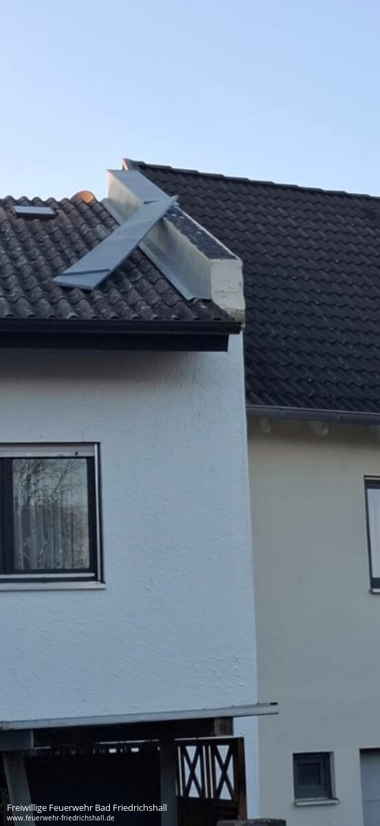 Um 16:15 Uhr wurde der Kommandant telefonisch über einen Sturmschaden an einem Gebäude informiert. Eine Blechverwahrung drohte auf den Gehweg zu stürzen. Über die Drehleiter konnte das Blech rasch entfernt und die Gefahr beseitigt werden.