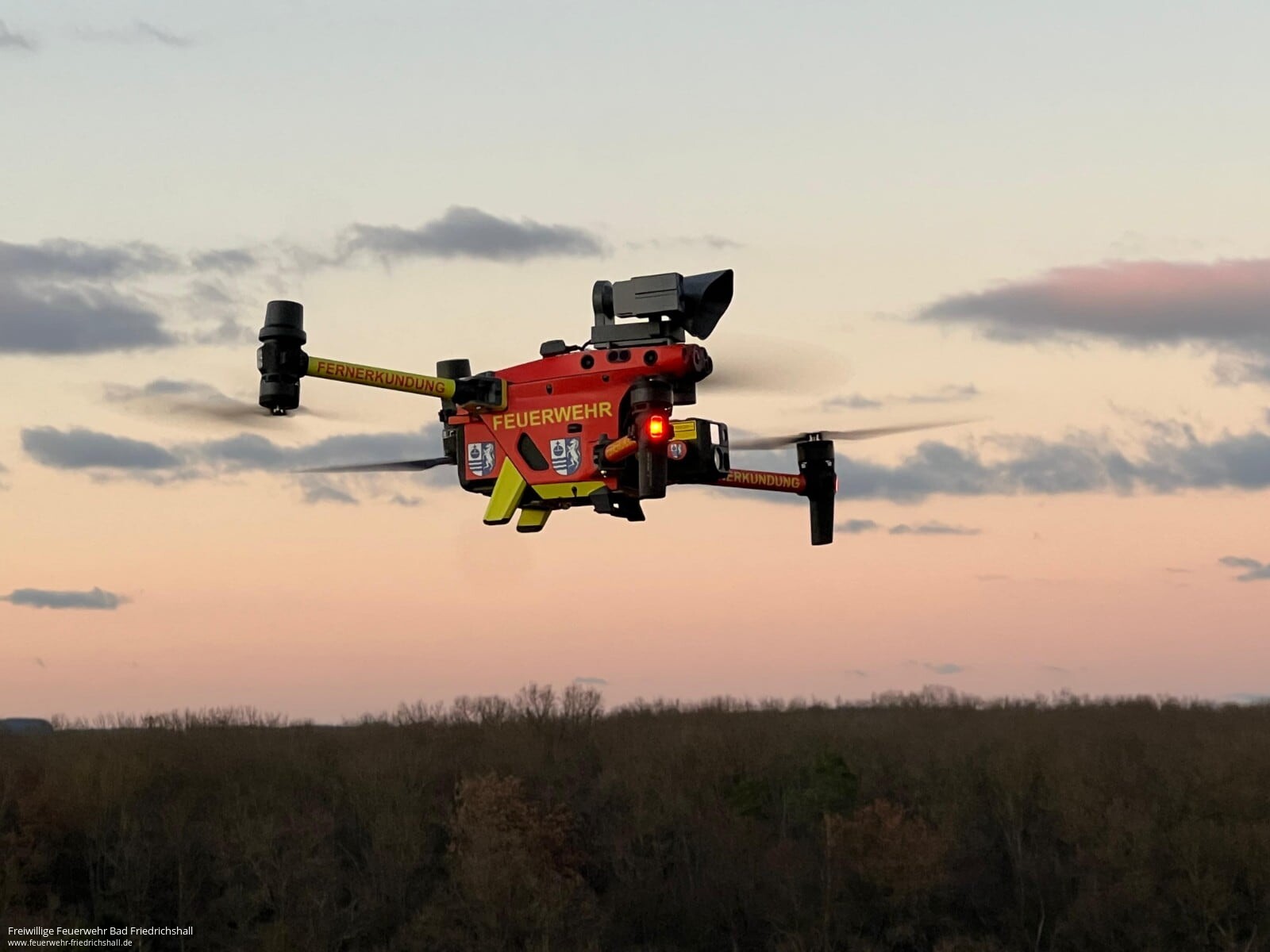 Die Feuerwehr Bad Friedrichshall setzt seit ca. 3 Jahren eine DJI M2EA im Feuerwehrdienst ein. Das Einsatzspektrum nahm in dieser Zeit stetig zu. So konnten bei zahlreichen Einsätzen Informationen zum Einsatzgeschehen über Bilder und Wärmebildkamera gesammelt werden. Zudem ist die Dokumentation über Bild und Video sehr wertvoll. Die seitherige Drohne konnte verkauft werden. Darüber hinaus war es noch möglich Spenden zu generieren. Somit wurde der Investitionsaufwand für die leistungsfähigere DJI M30T realisierbar. Hier nur einige Verbesserungen des Leistungsspektrums: Die M30T hat eine IP-55 Zertifizierung und ist somit selbst gegen Strahlwasser geschützt. So kann in Zukunft auch bei Regen geflogen werden, das bisher nicht möglich war. Die Wärmebildkamera ist auch sehr leistungsfähig. Ein 200facher Hybridzoom bietet ebenfalls ein Mehrwert bei z. B. Gefahrguteinsätzen. Weiterhin ein Laserentfernungsmesser, eine zweite FPV Kamera, Nachtsichtmodus, starke Scheinwerfer und Lautsprecher und vieles mehr. Dies ermöglicht eine Unterstützung bei Einsatzlagen die bisher nur mit enormem Aufwand oder gar nicht möglich waren. Bei dieser Gelegenheit vielen Dank an das DJI ProFLYCenter für die konstruktive und zielführende Zusammenarbeit sowie dem Feuerwehr Förderverein e.V., den Spendern und der Stadt Bad Friedrichshall.