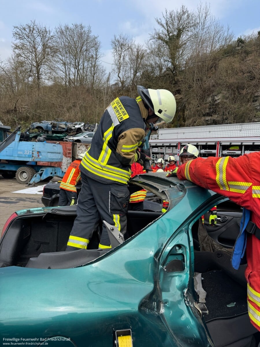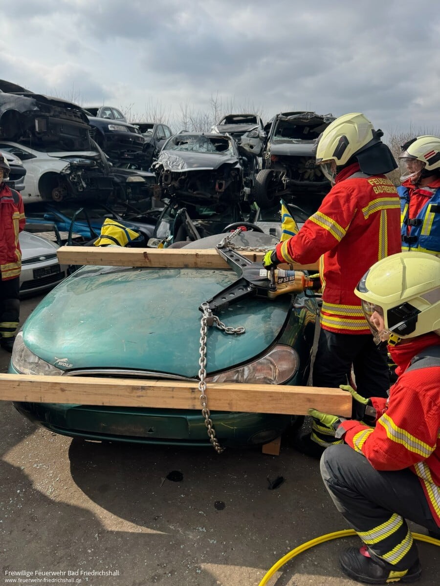 Auch die technische Hilfeleistung wurde intensiv geübt – hierfür stand ein weiterer Samstag zur Verfügung. Nach einer theoretischen Einführung in die benötigten Gerätschaften ging es auf einen Schrottplatz, wo das Schaffen von Zugangsöffnungen und die Rettung von Unfallopfern praxisnah trainiert wurden.